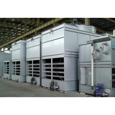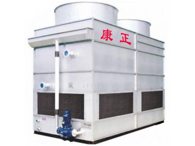 逆流式冷却塔的进风形式为底部逆流进风,与下落的喷淋水逆向交替形成饱和湿热空气,热量由顶部风机排出,水分由特殊结构的脱水器挡回集水槽循环使用,内部空间没有顶冷散热的填料,余出更多的空间来增加盘管的单位散热面积,结构紧凑,占地小。